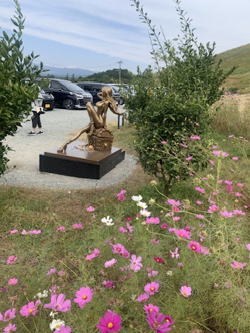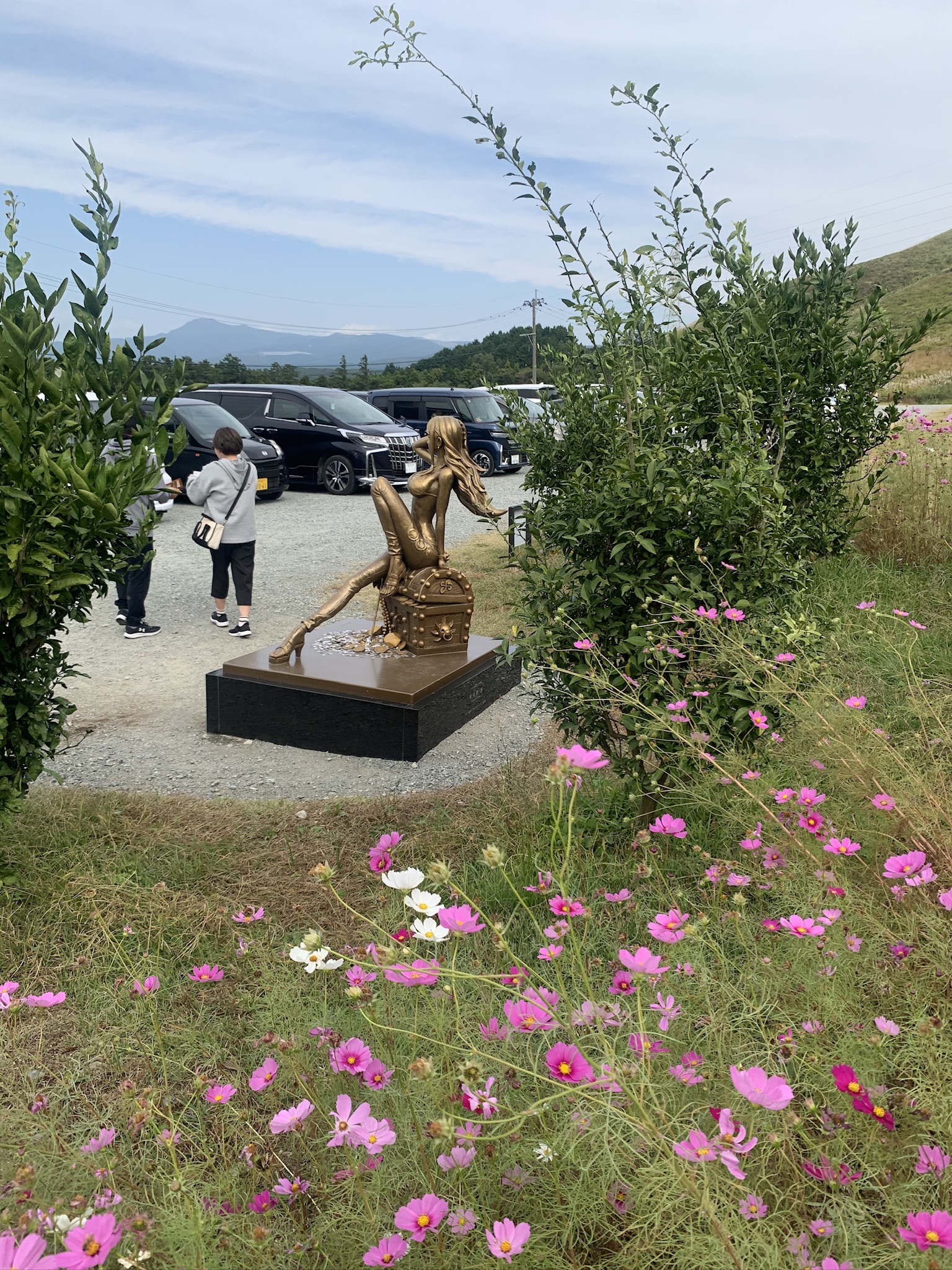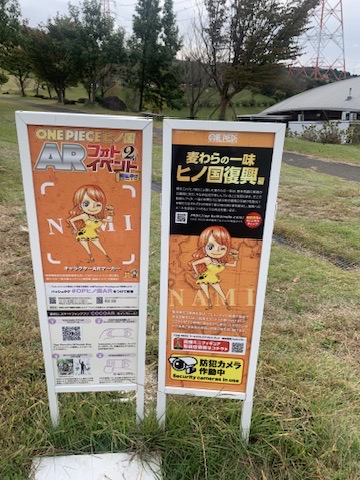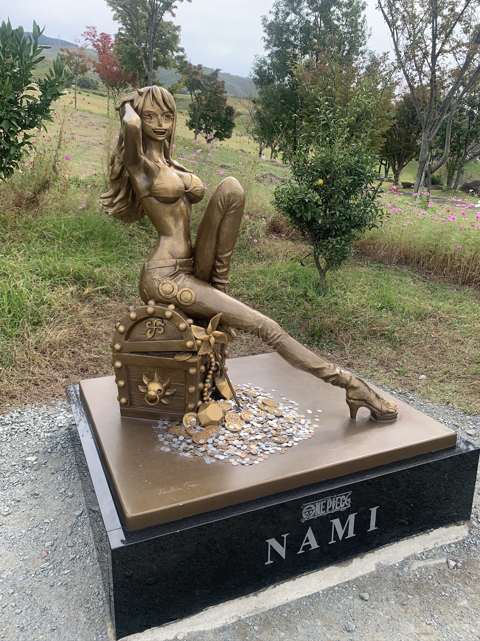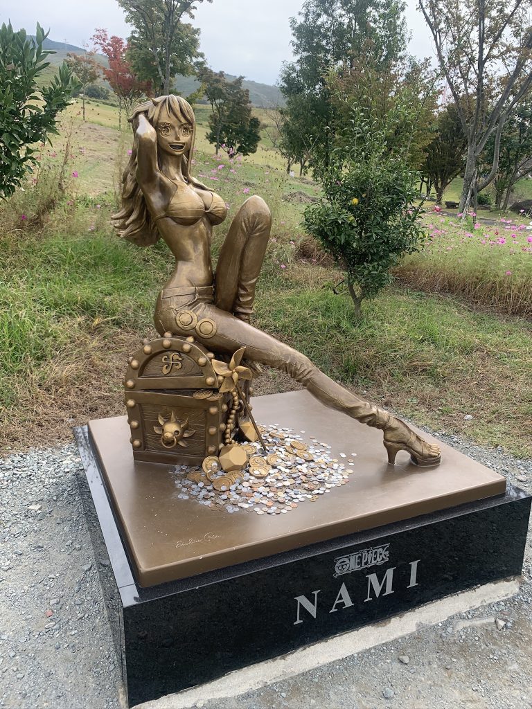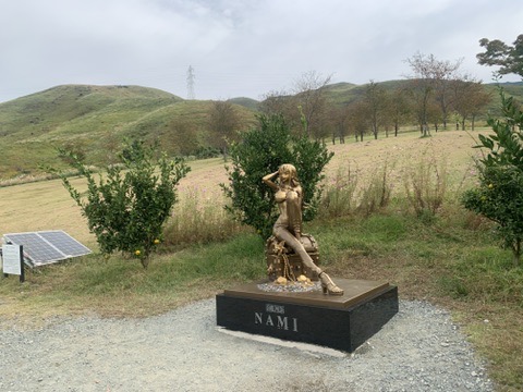 でも、今回は、最近始めた「ワンピース・キャラクター像巡り」の一環でやってきました。実は、萌の里の「ナミ像」は見たことがありませんでした。え?どこにあるの?という感じでやってきたら、駐車場入り口の正面に小さな案内板がありました。