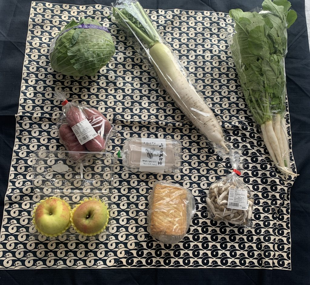 ちなみに、今日の収穫物。これだけ買って,1950円。りんごは、熊本産です。