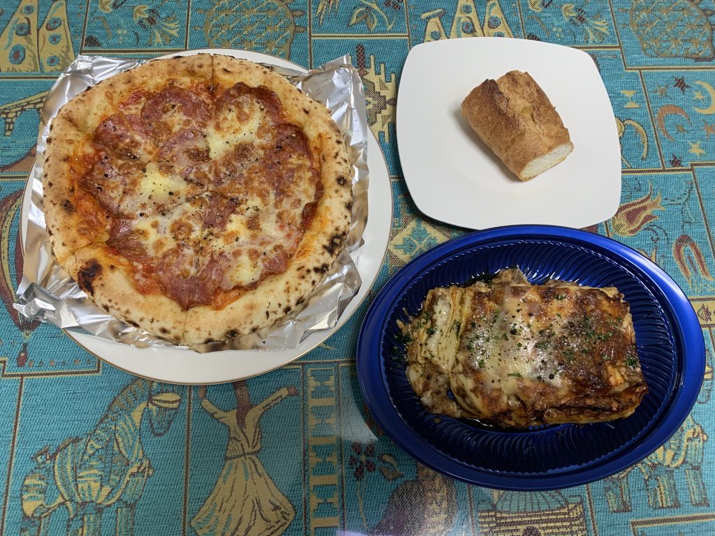 帰りには、久しぶりに、かつては三つ星レストランにお勤めだったというシェフが作るお店、「イタリアッソ」に立ち寄り、ピザとラザニア(フォカッチャ付き)を買って帰りました。