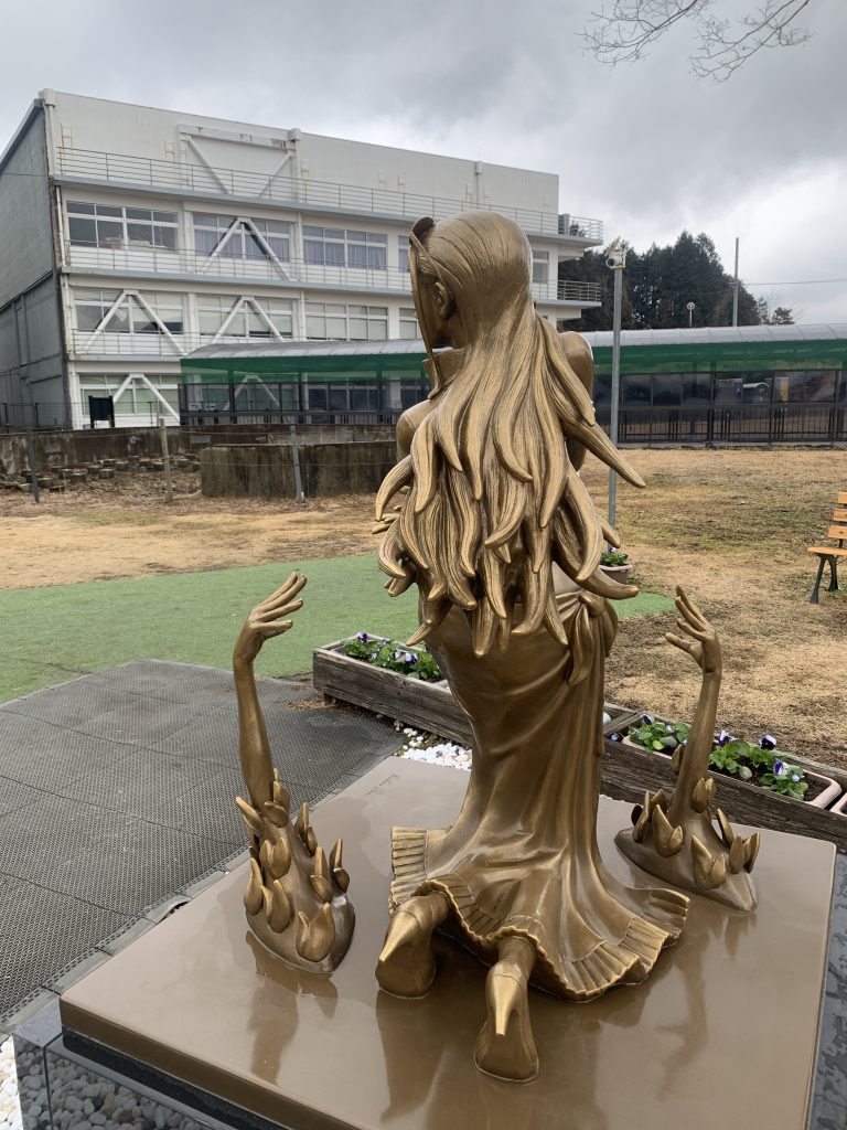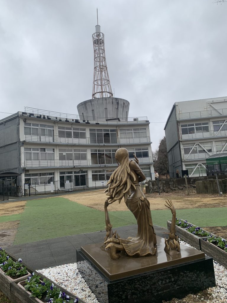 ロビン像は、2016年の熊本地震で多くの犠牲者を出した、旧東海大学キャンパスに建てられていました。残った本館をじっと見つめているようです。