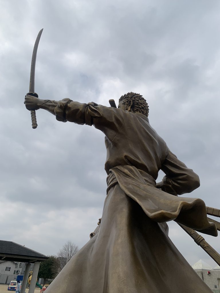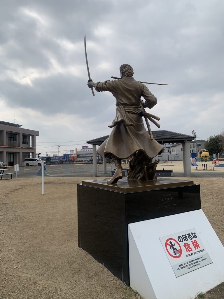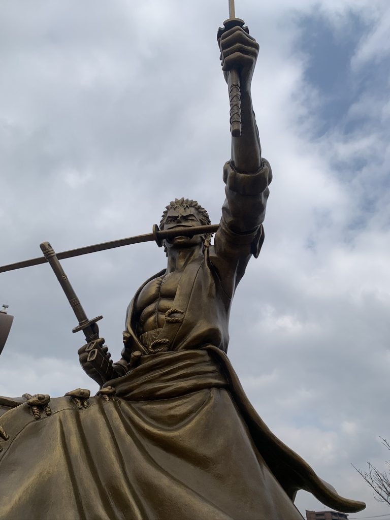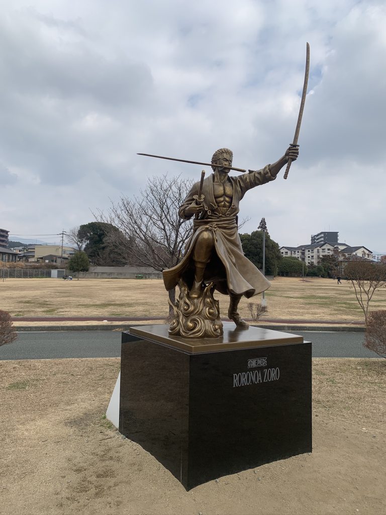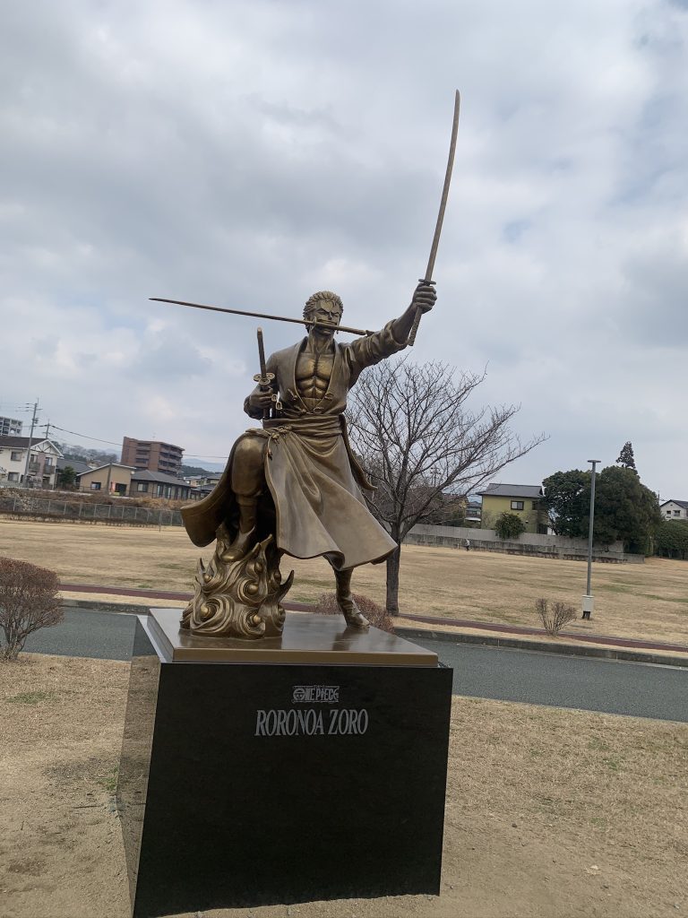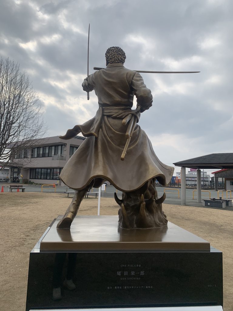 なんともかっこいい銅像でした。7つ目のワンピース像は、隣町「大津」の「ロロノア・ゾロ」です。